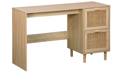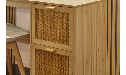 Su estructura combina una amplia superficie de trabajo con un módulo lateral de almacenaje que incluye dos cajones con frentes de rejilla natural, aportando textura y un estilo contemporáneo de inspiración artesanal. Los tiradores integrados y las patas elevadas refuerzan su diseño ligero y elegante, facilitando además la limpieza del espacio.
